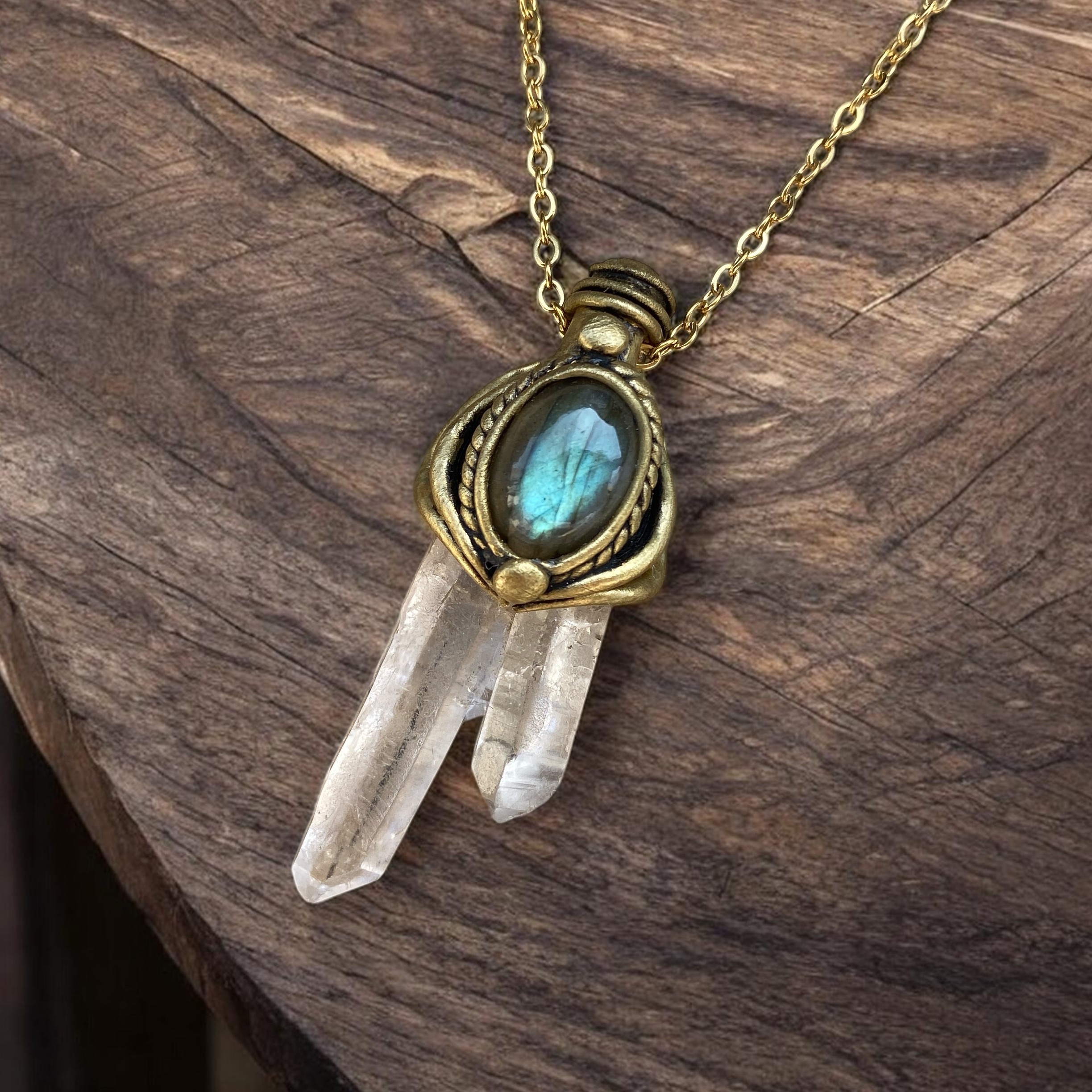 Colier lucrat manual din lut polimeric cu cristale naturale.